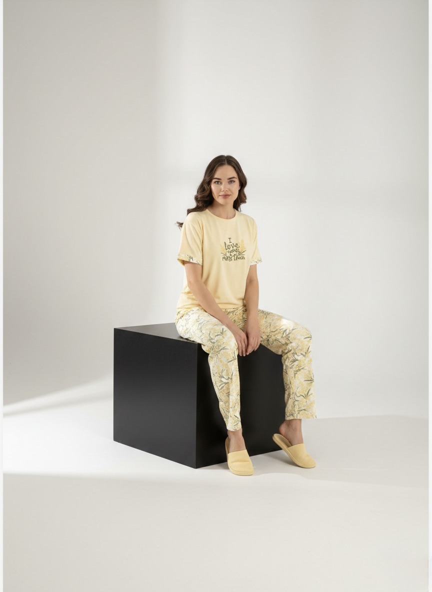 Sarı baskılı kısa kollu kadın pijama takımı