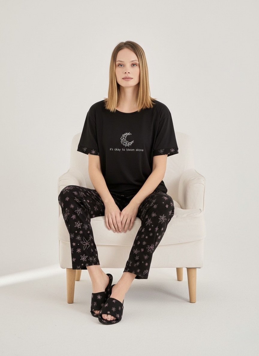 Siyah yıldız detaylı pamuklu pijama takımı